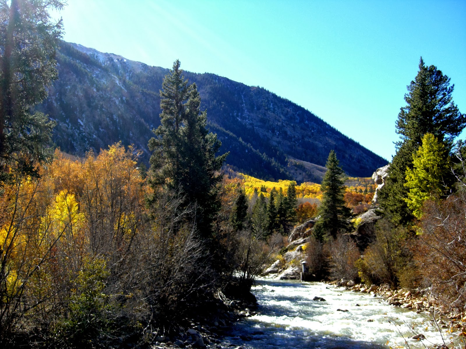 The morning started in the low 20F temperatures with 15 to 20 mph winds. So I began the cold drive glad that I books a cheap room (for Aspen) instead of camping. The four hour drive was filled with sweeping patches of colors, vast skylines of mountains, and snow dusted firs. Descending Independence Pass the aspens could be seen sparkling gold.